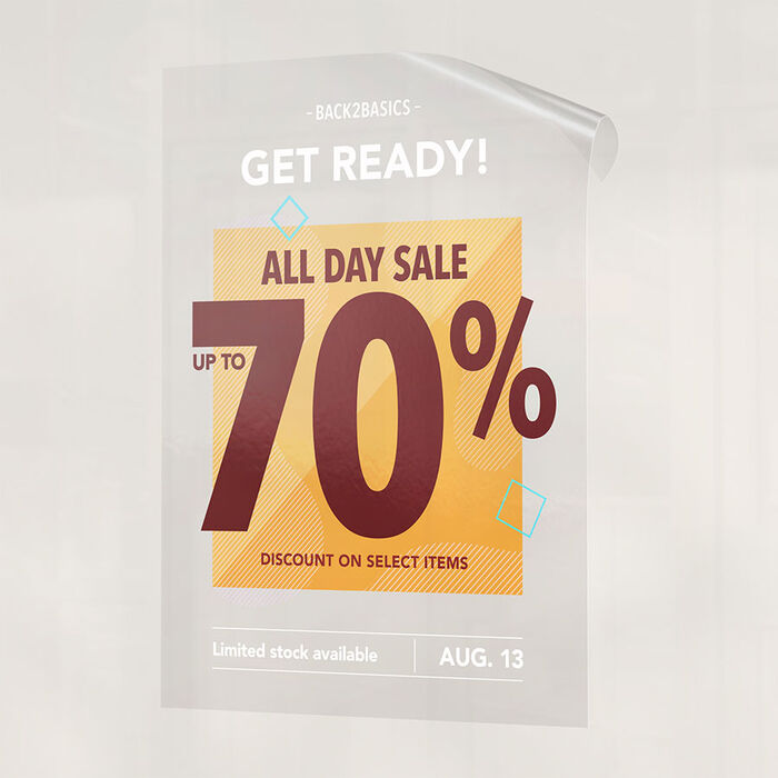 - Comes in a clear, white, or colored background; recommended for displays that want the store’s interior visible from the outside.